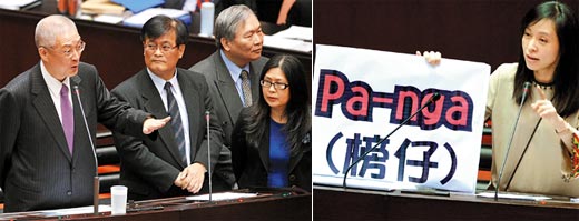 吳敦義被質(zhì)詢(xún);鶗(huì)廣告中“榜仔”是什么意思時(shí),吳敦義面色凝重表示歉意。