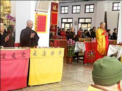 法雨寺12日舉辦春祭法會,因比丘地位高于比丘尼,千賢法師(右一)仍獲禮遇站上首地位,定義法師(右二)居于次席