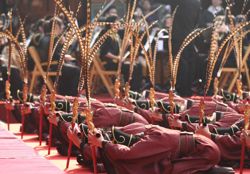 臺(tái)北孔廟13日舉行春祭典禮,臺(tái)灣藝術(shù)大學(xué)舞蹈系學(xué)生在大成殿前表演春祭新佾舞,展現(xiàn)舞蹈系底子的絕佳柔軟度。圖片來源:“中央社”