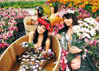 圖為模特兒穿戴上后里主要銷日花卉,包括百合、洋桔梗、文心蘭、火鶴,再以薰衣草等香草當泡澡主材放進泡浴桶,清涼入浴,在一片花海的花花世界中,更顯繽紛。