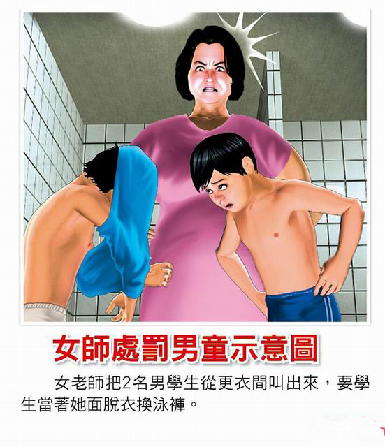 中國(guó)臺(tái)灣網(wǎng)4月18日消息 據(jù)臺(tái)灣媒體報(bào)道,臺(tái)灣校園又傳不當(dāng)體罰事件。臺(tái)北巿一所小學(xué)的一名體育女老師因不滿2名男學(xué)生上完游泳課后,在更衣間內(nèi)嬉鬧喧嘩,竟把學(xué)生叫出來當(dāng)著她面脫光換衣服,致男學(xué)生身心受創(chuàng),回家狂哭不已。該校校長(zhǎng)表示,昨已決定對(duì)女老師記過處分。臺(tái)北市教育局指事件可能涉及校園性騷擾,已要求學(xué)校徹查。