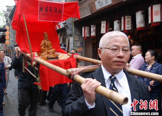 4月17日上午,在“三國(guó)圣地”成都武侯祠博物館三義廟,臺(tái)灣民間文化團(tuán)體“十分老街觀光發(fā)展協(xié)會(huì)”舉行了隆重的祭典儀式。圖為迎駕隊(duì)伍走過(guò)成都錦里古街。中新社發(fā) 羅景玠 攝