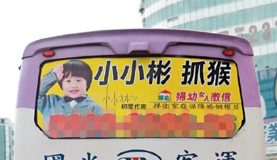 據(jù)臺灣《聯(lián)合報》報道,臺灣知名童星小小彬替征信業(yè)者代言,寫著“小小彬抓猴”(“抓猴”意為抓外遇)的廣告牌,放在客運車上在臺灣“趴趴走”,臺中市議員抨擊“兒童抓猴”是負面教育,市長胡志強認為很不妥,且違反“兒少法”,下令今天起“不撤廣告就開罰”。