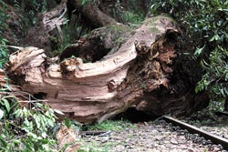 砸中列車、倒伏在鐵軌旁的森氏櫟支干,下半部木質(zhì)顏色正常、上半部卻可見黑壓壓一片的腐朽痕跡。片來源:臺灣《中國時報(bào)》