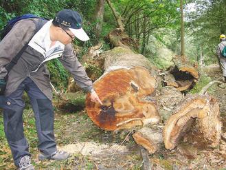 中興大學森林系助理教授曾彥學說明,造成小火車翻覆的森氏櫟腐朽情形,整棵斷木測量重達7.5噸。