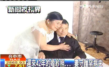 據(jù)臺灣TVBS電視臺報(bào)道,臺中一位黃太太在結(jié)婚42年后,總算如愿披上白紗,她16歲那年,不顧家人反對嫁給先生,沒公開宴客,也沒拍婚紗,8年前,先生罹患小腦萎縮癥,病情逐漸惡化,于是,3位兒女決定在母親節(jié)前夕,安排爸爸套上西裝、媽媽披上白紗,彌補(bǔ)當(dāng)年沒能拍婚紗照的遺憾。兩人堅(jiān)貞愛情令人動(dòng)容。