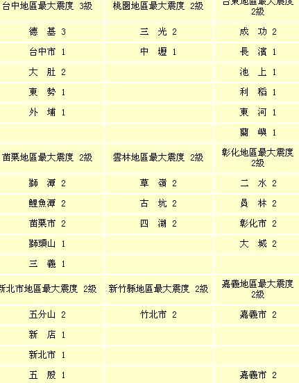 這起地震幾乎全臺(tái)有感,其它震度較大地區(qū)為花蓮市、宜蘭南澳3級(jí);宜蘭市、臺(tái)東成功、臺(tái)中市、苗栗市、彰化市為2級(jí);臺(tái)南市、新竹市、新北市、臺(tái)北市為1級(jí)。(中國(guó)臺(tái)灣網(wǎng) 馮存。
