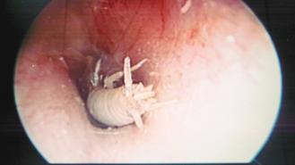 據(jù)報(bào)道,這名50歲男子到臺(tái)北馬偕醫(yī)院就診時(shí),只覺(jué)得耳朵里怪怪的,偶爾會(huì)聽(tīng)到耳鳴聲,但不覺(jué)疼痛。馬偕醫(yī)院耳鼻喉科醫(yī)師周家儀透過(guò)內(nèi)視鏡,在距離男子外耳道約1.5厘米處,發(fā)現(xiàn)一只黃白色、帶有觸須的小蟲(chóng),不時(shí)蠕動(dòng)身體,想往耳朵更深處鉆,周家儀以耳抽吸管活逮這只小蟲(chóng)。