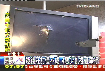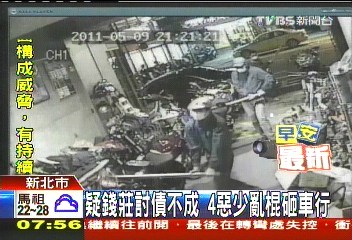 據(jù)臺灣TVBS電視臺報道,要錢不成竟然就砸店,昨天晚間9點半左右,臺灣新北市土城區(qū)一家重型機車行,遭到4名手持棍棒的少年,瘋狂亂砸,不僅店面遭殃,就連機車都被砸壞7輛,損失慘重,店主表示,3月中旬曾經(jīng)遭到錢莊份子暴力脅迫,強逼簽下本票,懷疑可能是當時協(xié)調(diào)不成,才會被挾怨報復。
