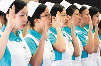 臺灣醫(yī)院護(hù)士荒,許多人拿到護(hù)士、護(hù)理師執(zhí)照后,卻不當(dāng)護(hù)士。圖為一所護(hù)校舉行加冠典禮,老師為所有小護(hù)生戴帽,并宣誓成為白衣天使。圖片來源:臺灣《聯(lián)合報(bào)》