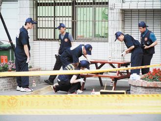 臺灣苗栗仁德醫(yī)專校園驚傳學(xué)生遭槍擊,4名歹徒在宿舍大樓旁的休閑桌椅處,用手槍敲擊兩名學(xué)生頭部,流彈并傷及另一名學(xué)生手指,警方在現(xiàn)場搜證。圖片來源:臺灣《聯(lián)合報》