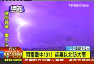 閃電與臺北101大樓連成一條直線,非常壯觀。圖片來源:臺灣TVBS電視臺