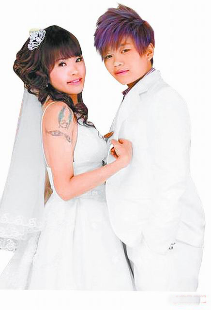 日前小笨與小狗來臺(tái)北度蜜月時(shí)接受《蘋果》專訪,在西門町里2人就像甜蜜的小情侶,打鬧、調(diào)情,憨直的新郎小笨僅19歲,目前是飯店服務(wù)員,而爆乳的辣妹新娘小狗25歲,則是發(fā)型設(shè)計(jì)師,他們說自小學(xué)起自覺是女同志,且早就向家人出柜,2人在網(wǎng)絡(luò)聊天室認(rèn)識(shí),5年來因家庭反對(duì)壓力而分分合合,最后決定廝守一生。