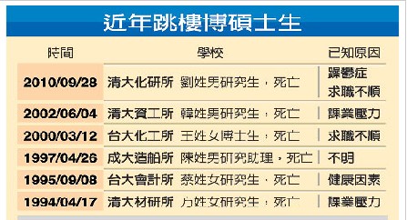 近年跳樓碩博士的一個統(tǒng)計,多為壓力或健康問題引發(fā)。圖片來源:臺灣聯(lián)合新聞網(wǎng)