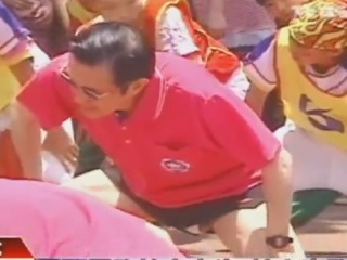 馬英九參加?xùn)|園小學(xué)百年校慶,下場(chǎng)跟小學(xué)生比賽800米接力賽,當(dāng)他抬腿暖身、雙腳打開(kāi)下蹲,露出白色內(nèi)褲。圖片來(lái)源:臺(tái)灣“今日新聞網(wǎng)”