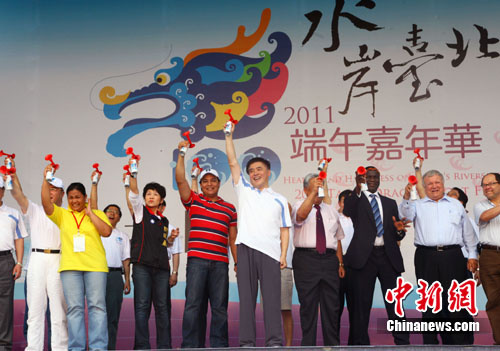 4日下午,“水岸臺北2011端午嘉年華”在臺北大佳河濱公園熱鬧揭幕。165支來自臺灣各地和菲律賓、新加波、澳大利亞等的龍舟隊將爭奪錦標,分享400萬元新臺幣獎金。