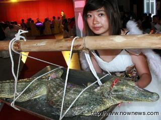 中國臺灣網(wǎng)6月7日消息 據(jù)臺灣“今日新聞網(wǎng)”報道,臺灣一名餐飲系女生,以20公斤重的兇猛鱷魚作為食材,在畢業(yè)成果展上展出,讓在場的觀眾不禁驚呼“美女與鱷魚”。
