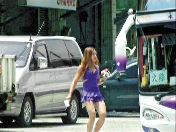 西施穿著短得不能再短的裙子,到過往車輛旁攬客。圖片來源:臺灣媒體