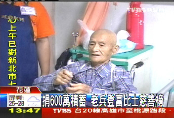 臺灣花蓮縣82歲的退伍老兵洪中海,將600萬新臺幣的畢生積蓄全部捐出,近日榮登亞洲慈善英雄榜。圖片來源:臺灣TVBS電視臺