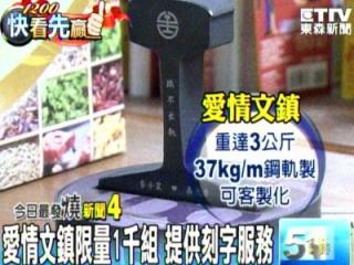 中國臺灣網(wǎng)7月17日消息 據(jù)臺灣東森電視臺報(bào)道,七夕臨近,臺鐵最近用火車鋼軌做成一千組文鎮(zhèn)(文鎮(zhèn),也叫鎮(zhèn)紙,即指寫字作畫時用以壓紙的東西),取名“貼不出軌”。情侶們紛紛驚呼,太有創(chuàng)意了。