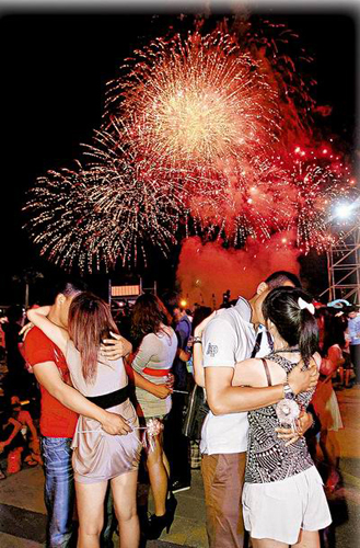 高雄市6日晚在茄萣情人碼頭舉辦“浪漫嗨趴”七夕活動(dòng),邀77對(duì)情人在璀璨的煙火映照下,擁吻77秒宣示愛情,受氣氛感染,臺(tái)下有些未報(bào)名的民眾也擁吻示愛,紀(jì)念七夕夜。圖片來(lái)源:臺(tái)灣媒體