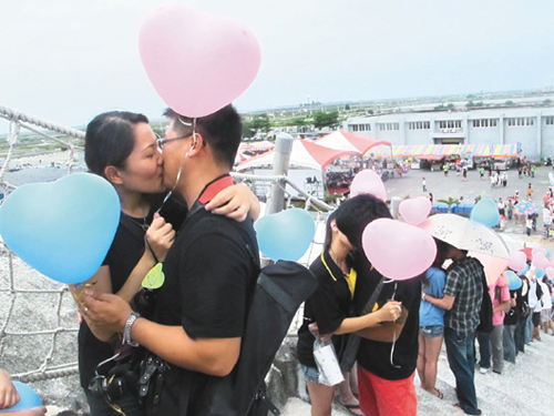 臺(tái)灣七股鹽雕藝術(shù)季在七夕情人節(jié)展開,活動(dòng)邀請(qǐng)50對(duì)夫妻、情侶登鹽山舌吻,現(xiàn)場(chǎng)充滿甜蜜氣息。圖片來(lái)源:臺(tái)灣《聯(lián)合報(bào)》