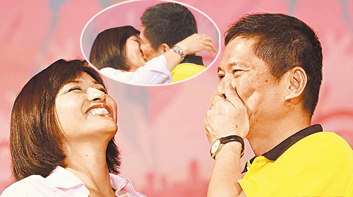 新婚3個(gè)多月的高雄市副市長(zhǎng)李永得(右)與愛妻、民進(jìn)黨民代邱議瑩,6日晚高調(diào)曬恩愛,兩人在高雄七夕情人節(jié)活動(dòng)中,加入77對(duì)情人擁吻77秒行列,還示范標(biāo)準(zhǔn)動(dòng)作(小圖)。圖片來(lái)源:臺(tái)灣媒體