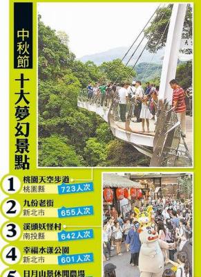 中國臺灣網(wǎng)9月12日消息 據(jù)臺灣媒體報道,11日,臺灣美食休閑分享網(wǎng)站“愛評網(wǎng)”公布網(wǎng)友票選中秋節(jié)最想去的10大夢幻景點(diǎn),桃園縣復(fù)興鄉(xiāng)的天空步道摘得桂冠,新北市九份老街和南投縣溪頭妖怪村分列2、3名。