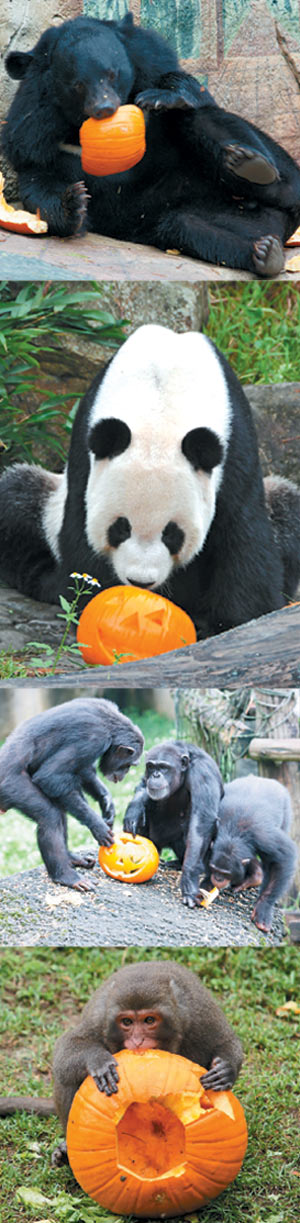 萬(wàn)圣節(jié)即將到來(lái),臺(tái)北市動(dòng)物園應(yīng)景提供南瓜給黑熊、貓熊、猩猩、獼猴等四種動(dòng)物品嘗。圖片來(lái)自臺(tái)灣媒體