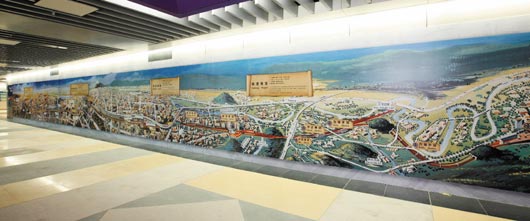 銜接捷運南港站與臺鐵南港站的通廊上,藏有一幅長達25.5公尺、素有“地鐵版清明上河圖”之稱的鐵路立體化工程圖。鐵工局表示,這幅工程圖繪制耗時28年,當切割為四階段的大臺北都會區(qū)鐵路立體化工程陸續(xù)完工,每完成一段,立體化工程圖便跟著添一筆。