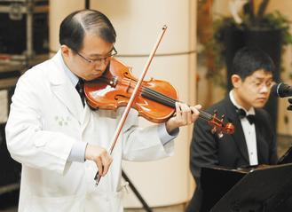 中國臺灣網(wǎng)11月9日消息 據(jù)臺灣《聯(lián)合報》報道,臺大醫(yī)院昨天舉辦醫(yī)師節(jié)感恩音樂會,擔綱的主角一位是執(zhí)行換腎手術(shù)的臺大外科醫(yī)師蔡孟昆,一位是換腎的音樂家莊天岳,醫(yī)病兩人合奏“愛的禮贊”,贏得滿堂采;蔡孟昆說,他已走出誤植艾滋器官事件的低潮期,靠的就是拉小提琴減輕壓力。