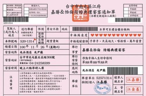 江嘉勝與黃怡倫的喜帖搞kuso,仿交通罰單的顏色與格式,充滿創(chuàng)意。(圖片來源:臺灣《聯(lián)合報》)