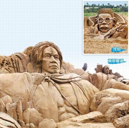 中國臺灣網(wǎng)1月8日消息 據(jù)臺灣《蘋果日報》報道,“2012年南投貓羅溪沙雕藝術(shù)節(jié)”昨天在風(fēng)景優(yōu)美的南投市貓羅溪畔登場,臺灣賣座電影《賽德克巴萊》、《臥虎藏龍》、《艋舺》、《海角七號》中的經(jīng)典形象被制作成大型沙雕。(中國臺灣網(wǎng) 李迪)