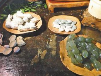 臺(tái)灣石雕家林仁德以玉石為原料雕鑿出毛豆、花生、瓜子等美食,維妙維肖。(圖片來(lái)源于:臺(tái)灣《聯(lián)合報(bào)》)