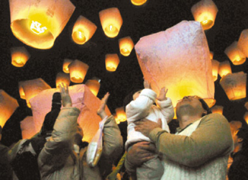 一家三口欣賞天燈美景。(圖片來源于:臺灣《聯(lián)合報(bào)》)