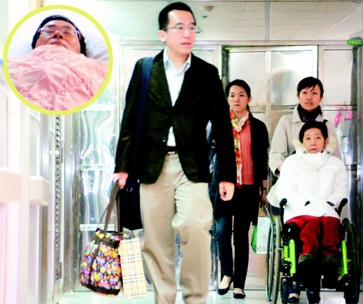 吳淑珍(前右)由媳婦黃睿靚(后右)、兒子陳致中(前左)、女兒陳幸妤(后左)陪同,到桃園醫(yī)院探視陳水扁(圓圖),一家人昨日在戒護(hù)病房團(tuán)聚。(圖片來源:臺灣《聯(lián)合報(bào)》)