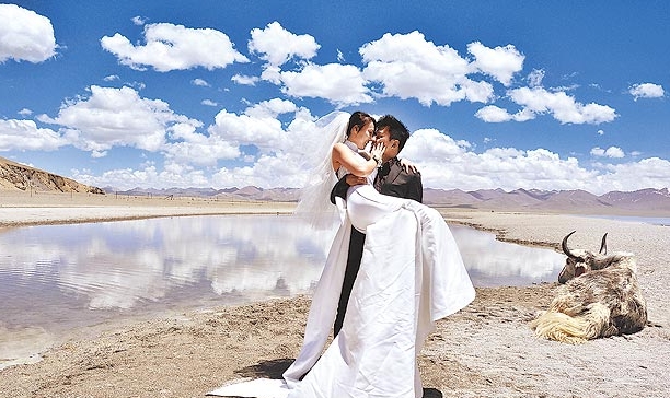 任職科技公司的邾(音同朱)亦為、賀楚芬,本月下旬將步入禮堂。兩人受訪時說,西藏是他們夢想的旅游勝地,上月籌辦婚禮過程中,興起去西藏拍婚紗照的念頭,但請隨行攝影師太貴,只好自行帶著重達20公斤的攝影器材和婚紗行頭,跟旅行團一起去,并請同團導游協(xié)助拍攝。