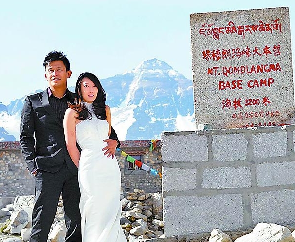 為留下一生一次的回憶,很多新人選擇特殊景點拍婚紗照。臺北市一對準新人,上月扛著白紗禮服跑到西藏自拍婚紗照,不但得克服高山癥,新娘還穿著高跟鞋與露肩婚紗,在海拔5200米的珠峰(圣母峰)登山口拍照,新娘說:“我應是史上在地球表面最高處穿婚紗的新娘,很有意義!