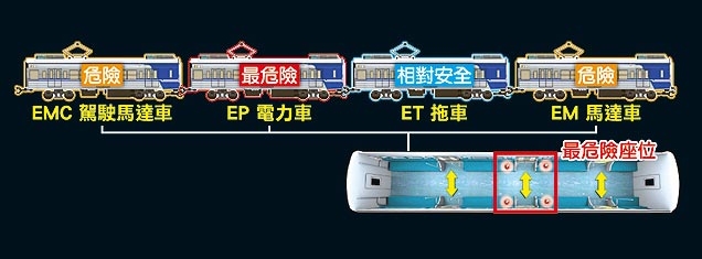 區(qū)間車以外觀標(biāo)有ET(箭頭)字樣的無(wú)動(dòng)力車廂相對(duì)較安全。來(lái)源:臺(tái)灣媒體