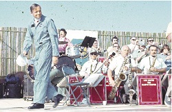 阿姆斯特朗(左)1969年12月與知名諧星鮑勃霍伯來臺,并在清泉崗空捐機地慰勞駐臺美軍,圖為阿姆斯特朗身穿飛行衣,大談他的太空經(jīng)驗。來源:臺灣《中國時報》