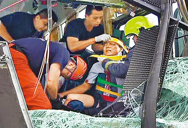 大客車司機(jī)被卡在駕駛座上,表情痛苦,警消人員急忙將司機(jī)救出送醫(yī)。(圖片來(lái)自臺(tái)媒)