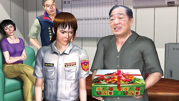 2.基隆市長(zhǎng)張通榮與議員沈義傳趕到分駐所,以廖女是精神病患為由,要女警原諒她,并送上水果禮盒。