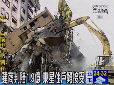 中國(guó)臺(tái)灣網(wǎng)9月22日消息 據(jù)臺(tái)灣“東森新聞網(wǎng)” 報(bào)道,昨天是臺(tái)灣9·21大地震13周年紀(jì)念日,當(dāng)年的9·21大地震造成臺(tái)北東星大樓倒塌,共87人死亡。如今,這起由大地震造成的民事官司在打了整整12年之后,于21號(hào)下午宣判。臺(tái)北地方法院一審判定,鴻固營(yíng)建需要賠償住戶總共1億9000多萬(wàn)元(新臺(tái)幣 下同),但面對(duì)這樣的結(jié)果,住戶們無(wú)法接受,決定再上訴。