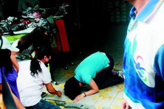 死者家屬到施姓男子家中撒冥紙,施某母親(藍(lán)衣)下跪向家屬道歉,表示會(huì)全權(quán)負(fù)責(zé)。圖片來源:臺灣《聯(lián)合報(bào)》
