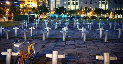 臺(tái)北市政府在捷運(yùn)站附近提供公用自行車租用服務(wù),目前共有50余個(gè)租用站,照片上的地點(diǎn)位于忠孝東路五段與松仁路口。租用站在綠地上鋪上石板,照片中有幾十根停車柱整齊排列,腳踏車因?yàn)槎急蛔獬,因此在燈光下看來就像“墓地”,還被惡搞成反核示意圖。