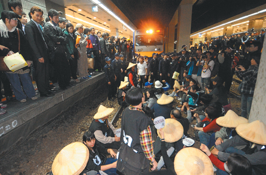 據(jù)臺(tái)灣《聯(lián)合報(bào)》報(bào)道,昨晚7時(shí)40分,近200名勞工“攻占”臺(tái)北火車站第3月臺(tái)后,數(shù)十位年長(zhǎng)勞工于8時(shí)許火車進(jìn)站時(shí)集體跳下月臺(tái)臥軌。晚間近9時(shí),臺(tái)北鐵路警察驅(qū)離軌道上的抗議者,列車逐漸恢復(fù)通行。不過,臺(tái)北站第3月臺(tái)上的抗議者直到晚間10時(shí)58分才被清場(chǎng)。據(jù)臺(tái)鐵估計(jì),昨晚因勞工抗議活動(dòng),共有40列次火車晚點(diǎn),延誤超過10600名旅客。