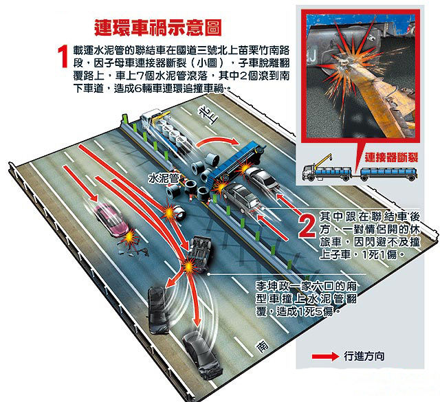 辦案交警指出,車禍死傷8人分屬兩輛車,一輛南下廂型車遭水泥管撞上,車上一家6口參加喜宴途中遇險,名叫李盈昀(24歲)的女性坐右前座遭遇正面撞擊,頭顱骨折傷重不治,坐后座的李佳玟(22歲)則頭顱蜘蛛網(wǎng)膜破裂,仍在加護病房救治。另一輛車則是北上跟在聯(lián)結車后面,車上坐一對情侶,男的受傷,女的則頭部遭重創(chuàng)不治。