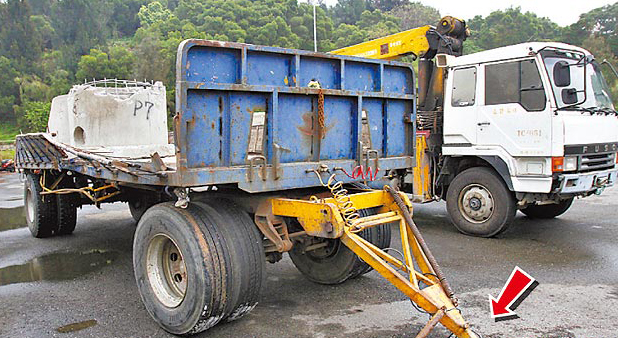 肇事聯(lián)結子車的連接器(箭頭處)斷裂。(圖片來自臺媒)