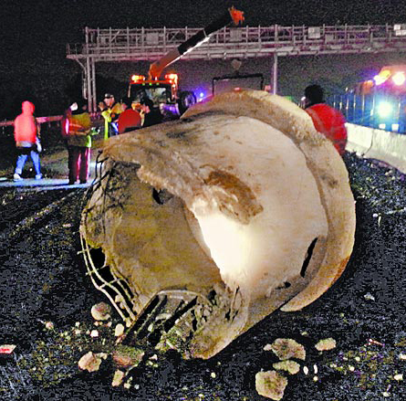 聯(lián)結車的子車脫落翻倒,車上重2公噸的水泥管滾到路中釀禍。(圖片來自臺媒)