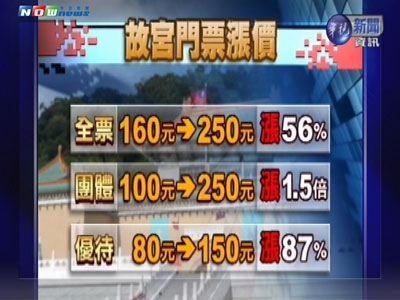 臺北故宮日前宣布票價即將漲價,普通票自160元(新臺幣,下同)漲到250元,優(yōu)惠票從80元調漲到150元,漲幅8成。團體票漲更兇,從100元漲到250元,更是漲了1.5倍。
